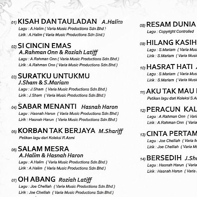 CT - Irama Pop Disk 1 Siti Nurhaliza - Airmata Ibu. Senarai ini termasuklah lagu dari album penuhsemasa bersama the boyssoloduetfeaturing kompilasi rakam semulatribute. Tujuh 7 buah lagu yang meraih kemenangan dalam kategori ini mempunyai nuansa muzik timur tengah iaitu Ghazal Untuk Rabiah Balqis Mimpi Laila Nirmala Wassini Aduh Saliha dan Warkah Buatmu Laila.